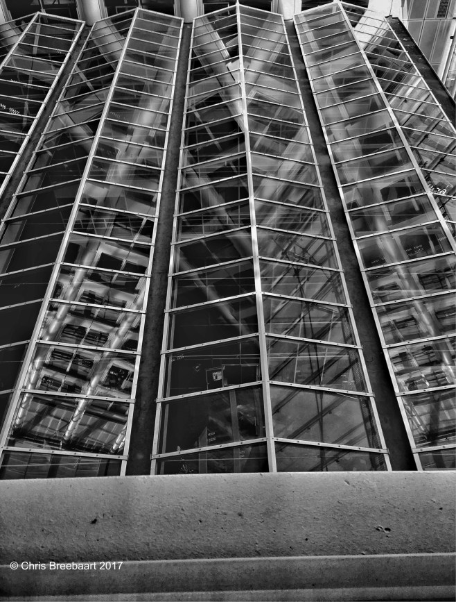You look down from the 9th floor aka 10 in America on the glass that shields off the open space to the Road below. The reflections are the floor floors above it (5 to 15)