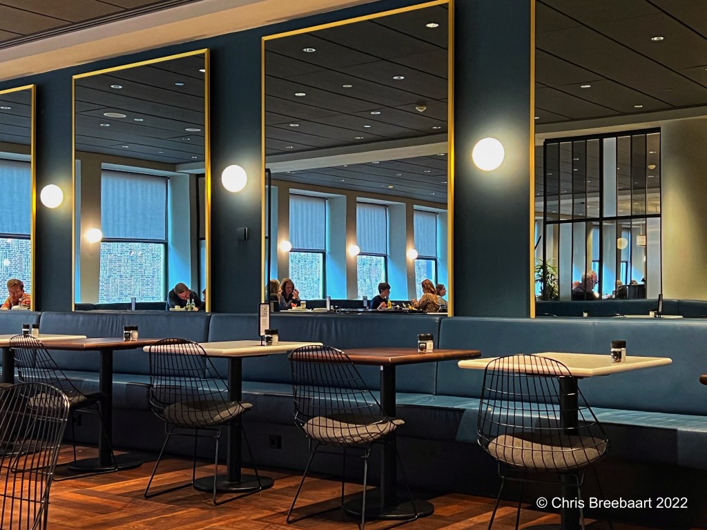 I like the contrast between the coolness of the seats and the warmth in the floor, as well as the alternating colors in the table tops. Love the blues!