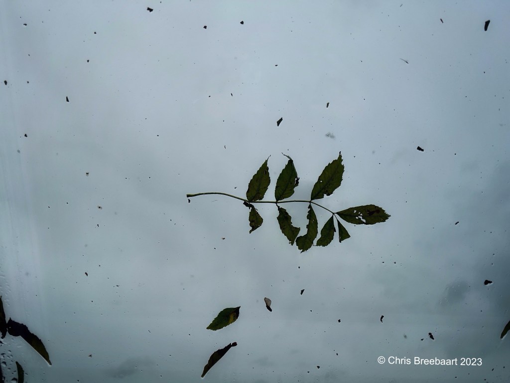 It’s looking up thru a window in the roof. The big leaf is stuck, the others flow buy on the storm
