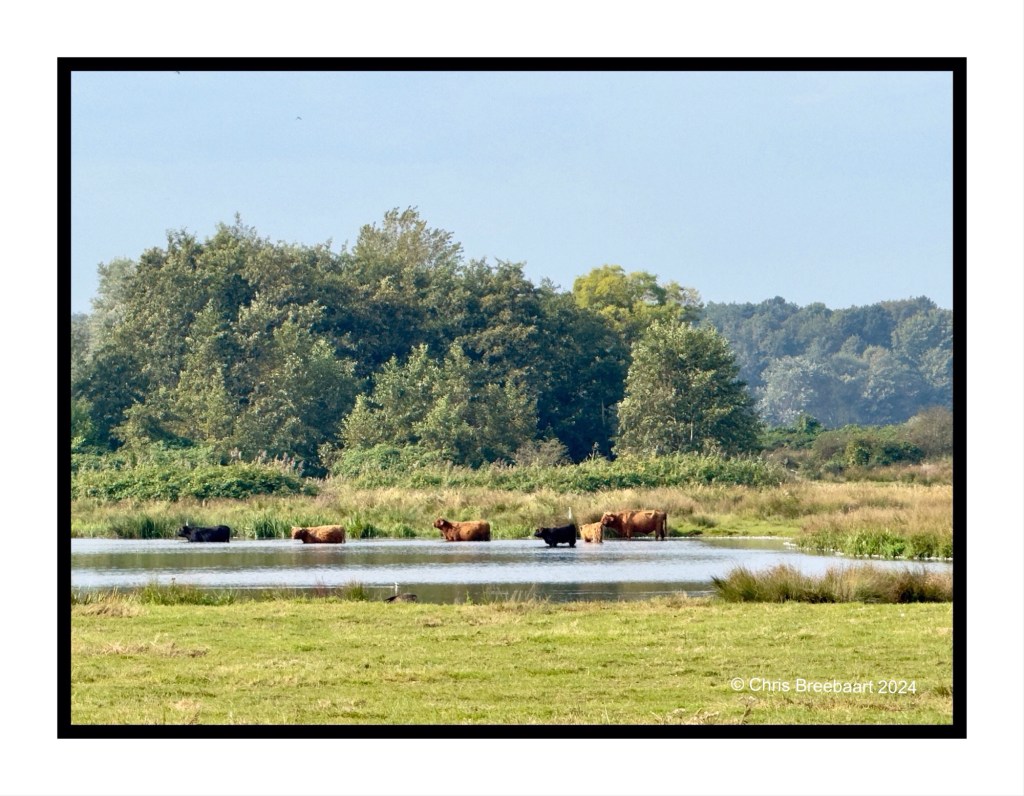 ‘Wild cows’ enjoy the water in the dunes near Valkenburg. The image is taken by hand on the maximum zoom of the iPhone, so it is a bit unsharp.