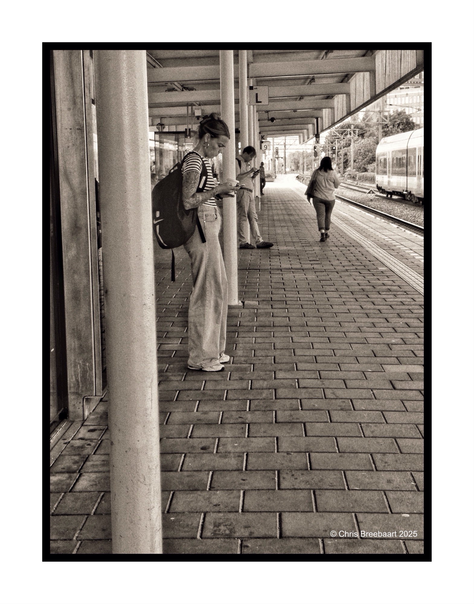 On the platform waiting for a connection being connected by mobile phone.