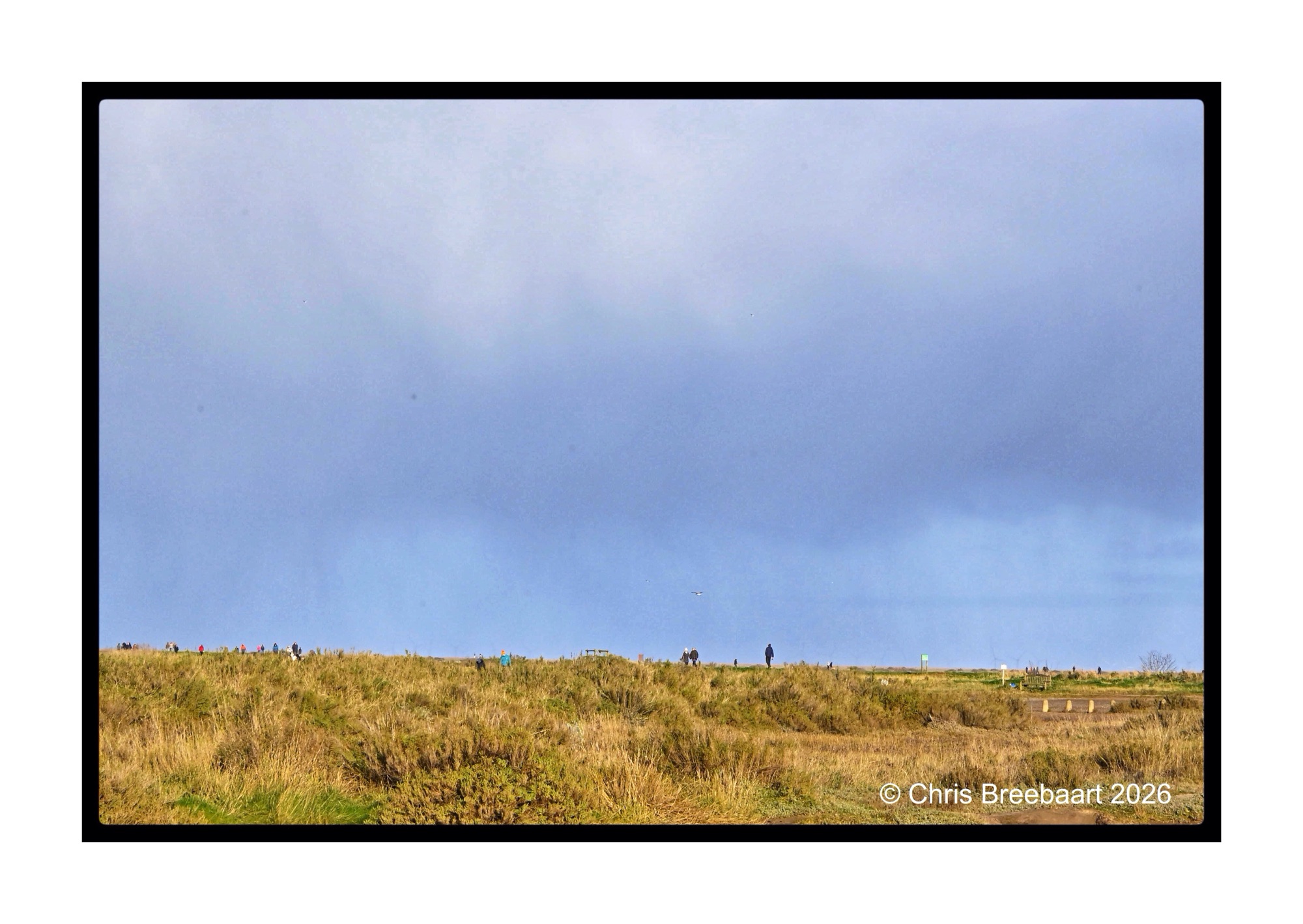 A wide landscape featuring a grassy hill with various people walking along the top, under a cloudy sky.